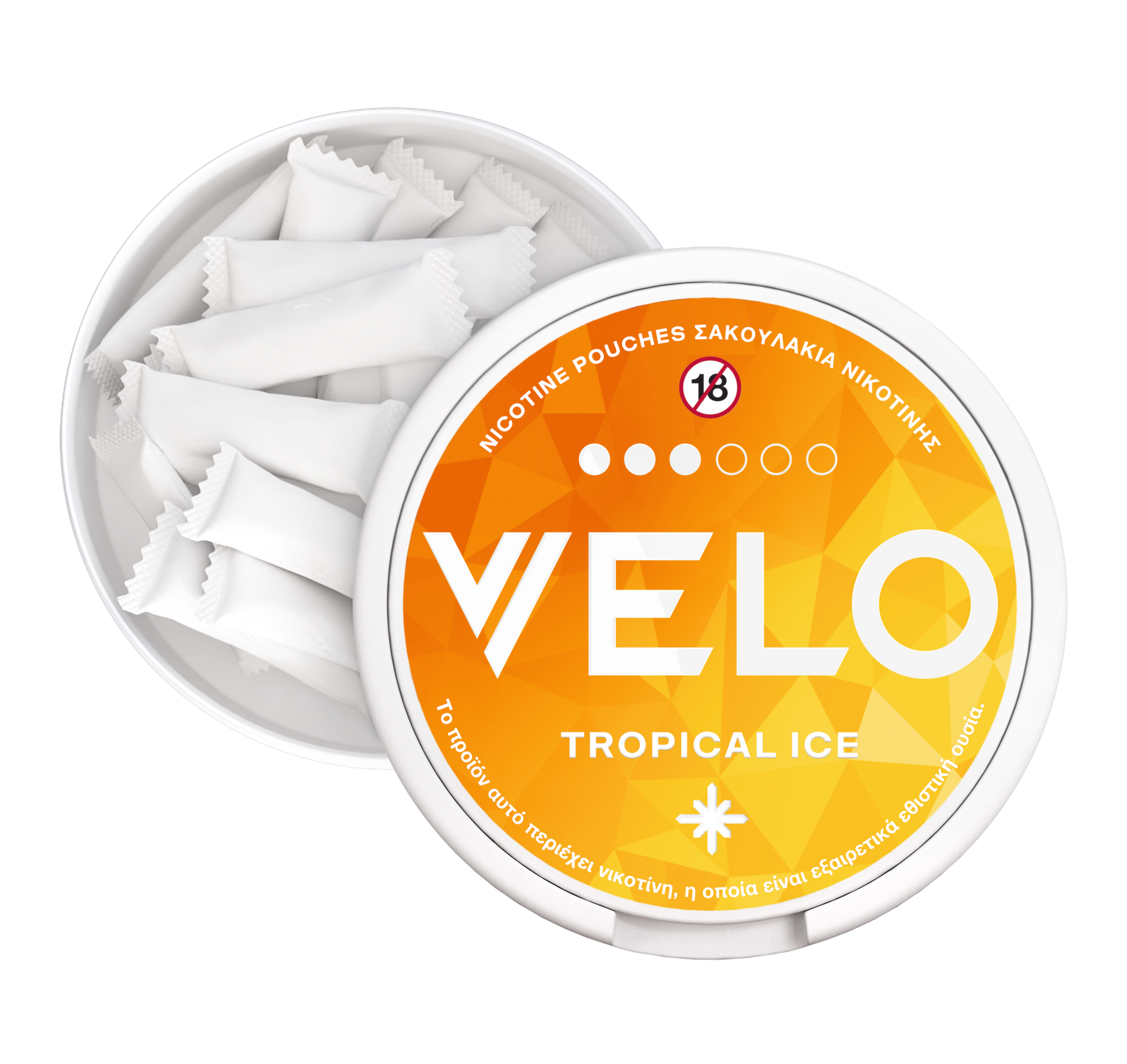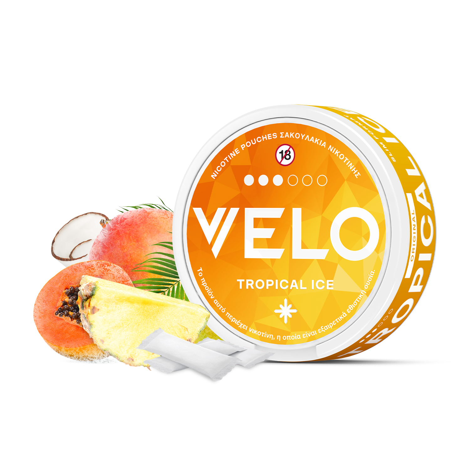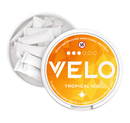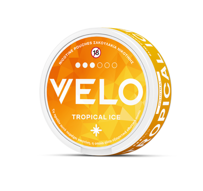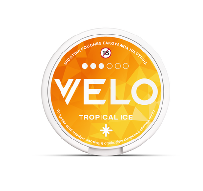 Το VELO Tropical Ice διαθέτει άρωμα τροπικών φρούτων από ανανά, καρύδα, μάνγκο και παπάγια με αίσθηση δροσιάς.